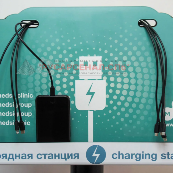Чуть выше кронштейна находится само зарядное устройство, оснащенное 8-мью выходами USB. Зарядные кабели для телефонов выводятся через специальные технологические отверстия на лицевую сторону станции.