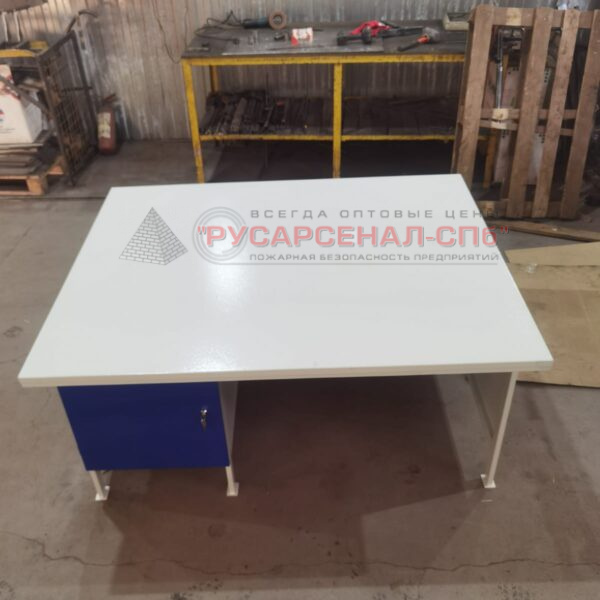Верстак состоит из металлического стола (столешница), стандартной тумбы и выдвижного ящика. Верстак изготавливается из листовой стали 2,0 мм и профильной трубы 40-20, облицовка полки и двери – металл 0,8 мм. Цвет верстака – серый RAL 7035, цвет двери —  RAL 5002.